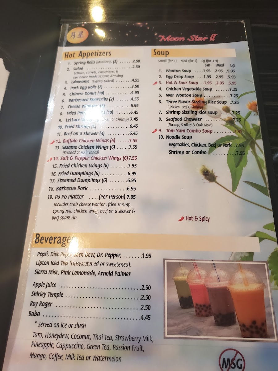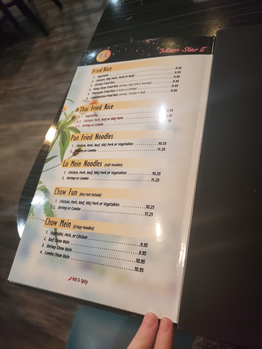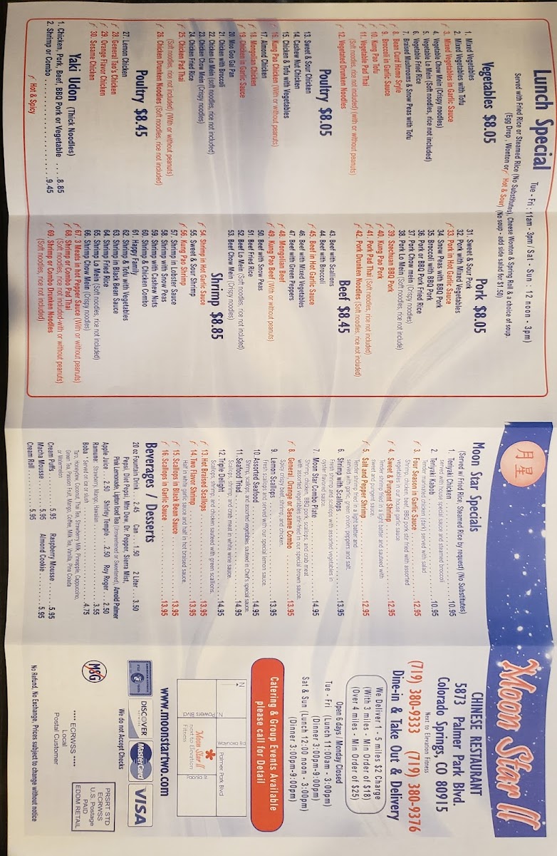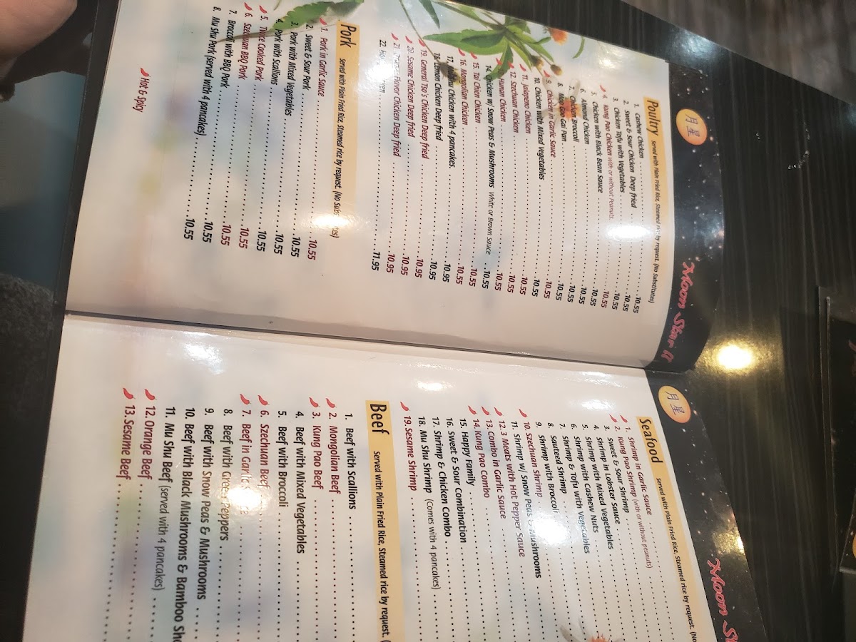 Located at 5873 Palmer Park Blvd, Colorado Springs, CO, Moon Star Ii Menu offers an exciting array of authentic Chinese dishes perfect for satisfying any craving. Whether you're in the mood for flavorful stir-fries, savory soups, or delicious dim sum, this menu has something for everyone. You'll find the freshest ingredients and expert preparation in every bite, from classic favorites to unique chef specials. Dive into a world of rich, aromatic flavors that are sure to leave you wanting more. With its welcoming atmosphere and diverse selection, Moon Star Ii is the perfect place to indulge in some comforting, flavorful Chinese cuisine.