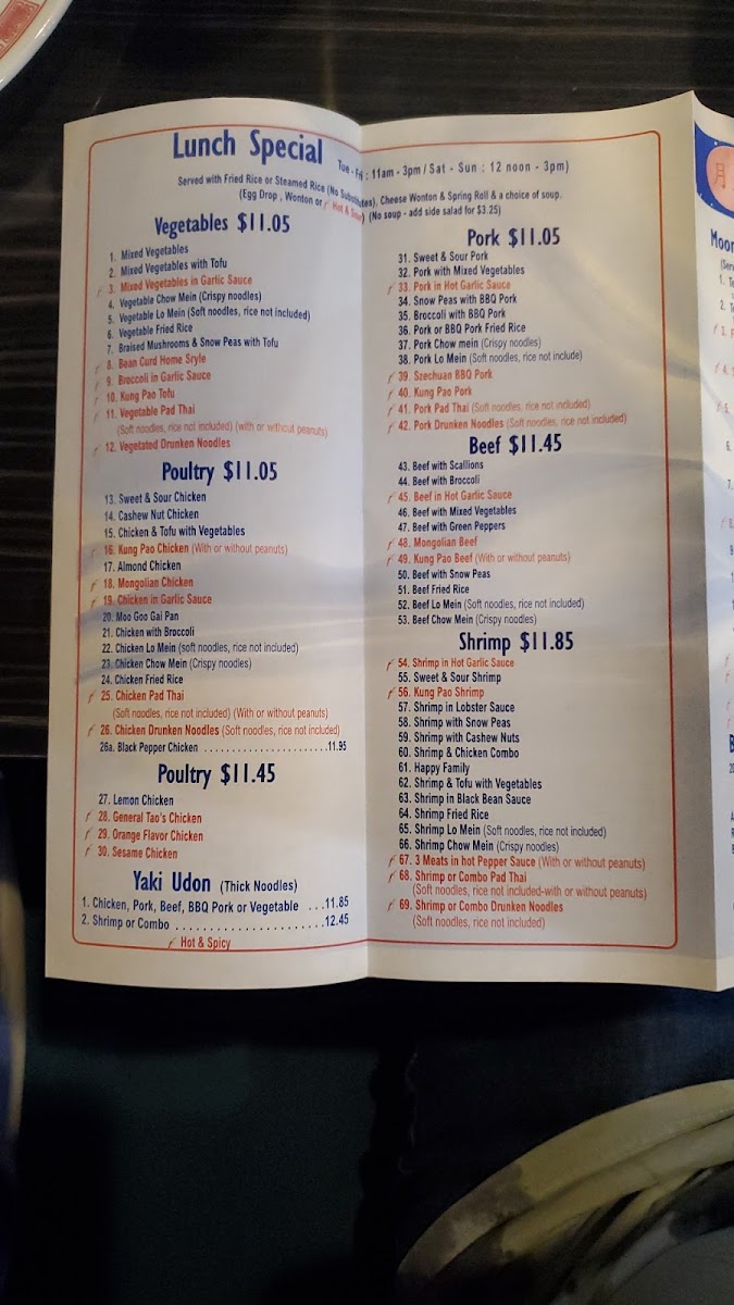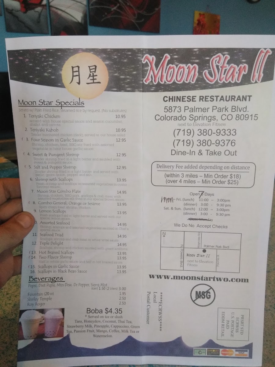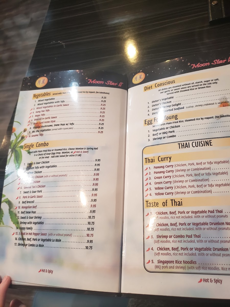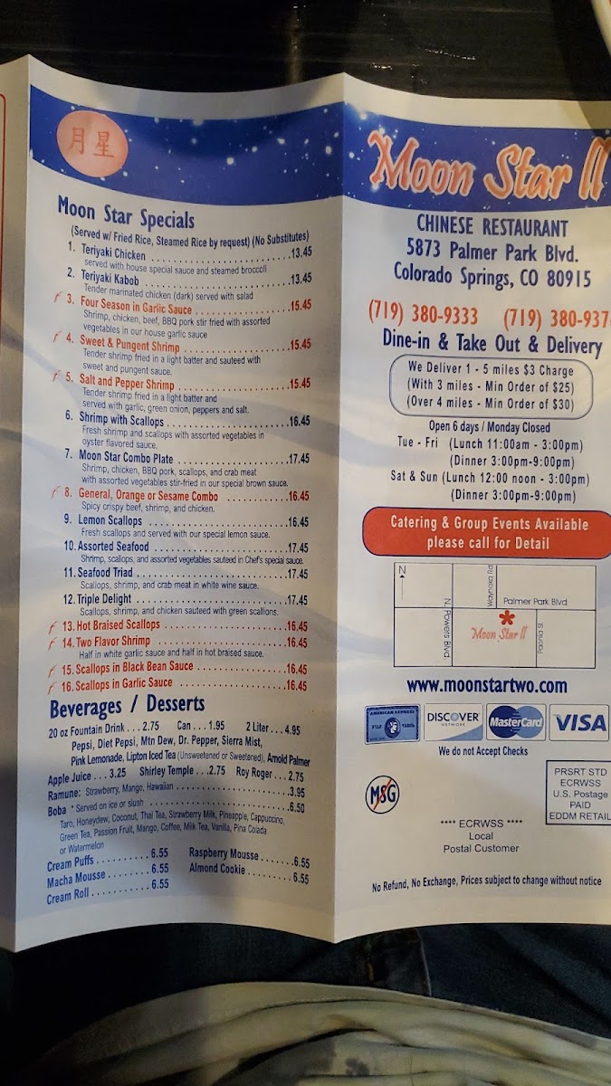 Located at 5873 Palmer Park Blvd, Colorado Springs, CO, Moon Star Ii Menu offers an exciting array of authentic Chinese dishes perfect for satisfying any craving. Whether you're in the mood for flavorful stir-fries, savory soups, or delicious dim sum, this menu has something for everyone. You'll find the freshest ingredients and expert preparation in every bite, from classic favorites to unique chef specials. Dive into a world of rich, aromatic flavors that are sure to leave you wanting more. With its welcoming atmosphere and diverse selection, Moon Star Ii is the perfect place to indulge in some comforting, flavorful Chinese cuisine.